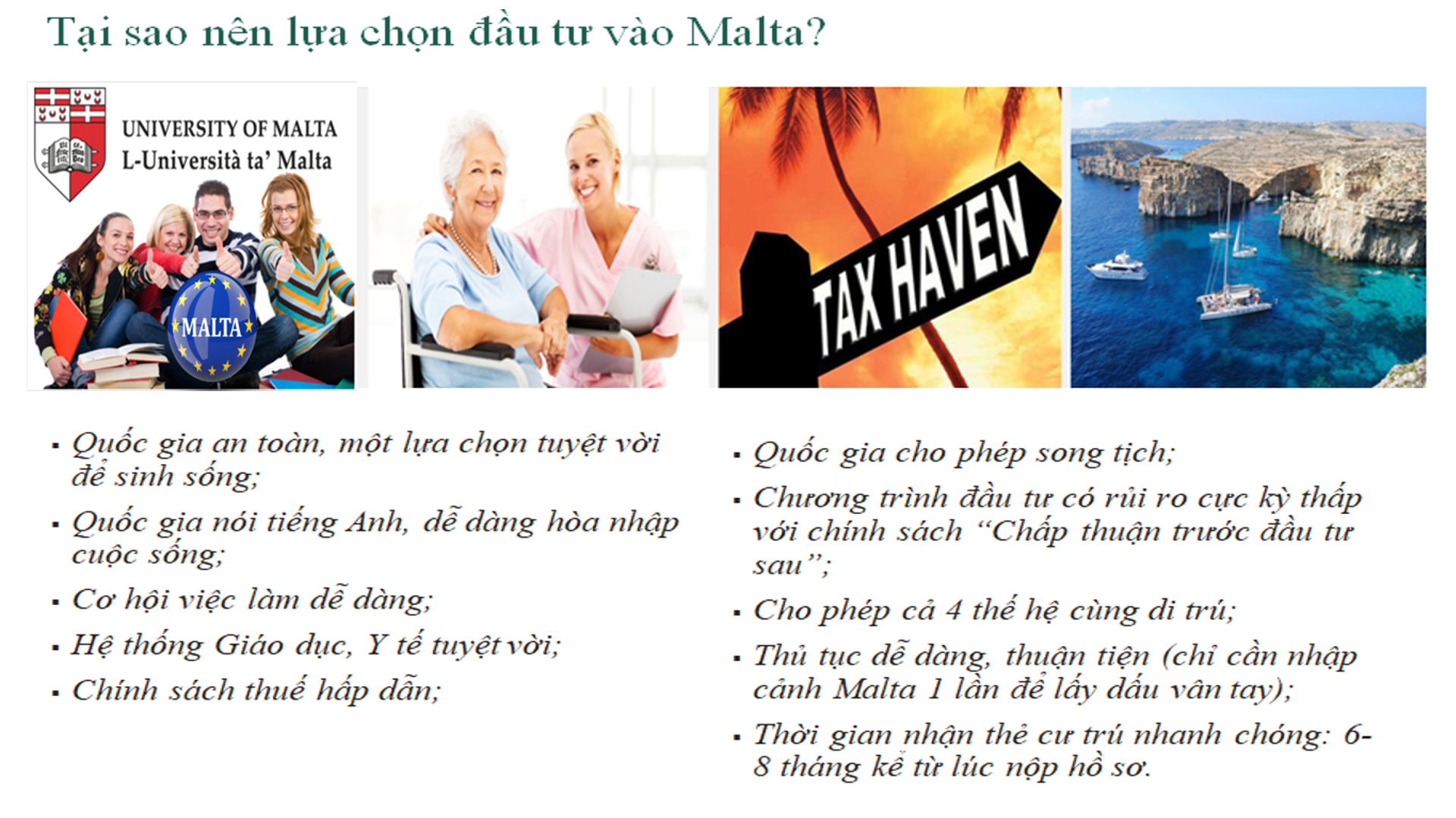 Malta là một quốc gia không đánh thuế thu nhập trên toàn cầu và không phải trả thuế đối với tài sản ở nước ngoài. Cho đến nay, Malta đã ký các thỏa thuận với 76 quốc gia (kể cả Việt Nam áp dụng từ ngày 01/01/2017) để tránh đánh thuế hai lần