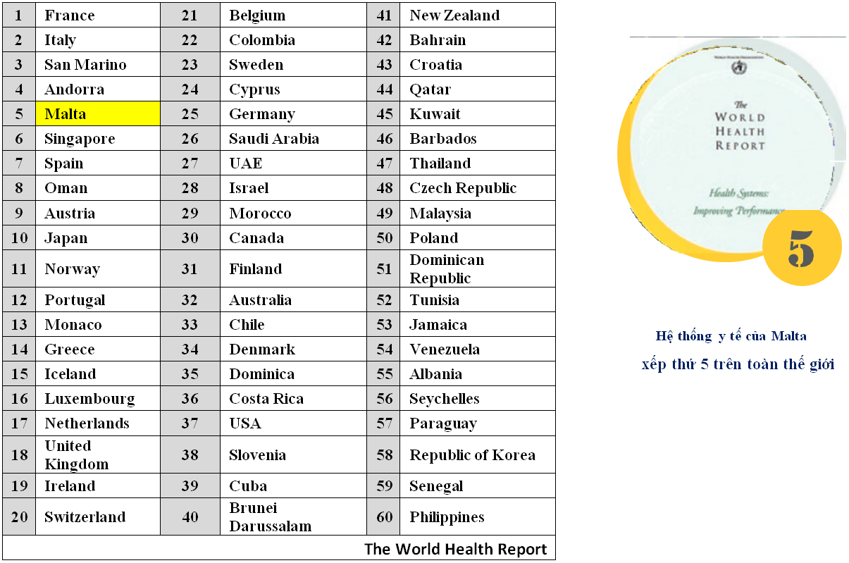 Dựa theo báo cáo của tổ chức y tế thế giới WHO, hệ thống y tế của Malta xếp thứ 5 trên toàn thế giới.
