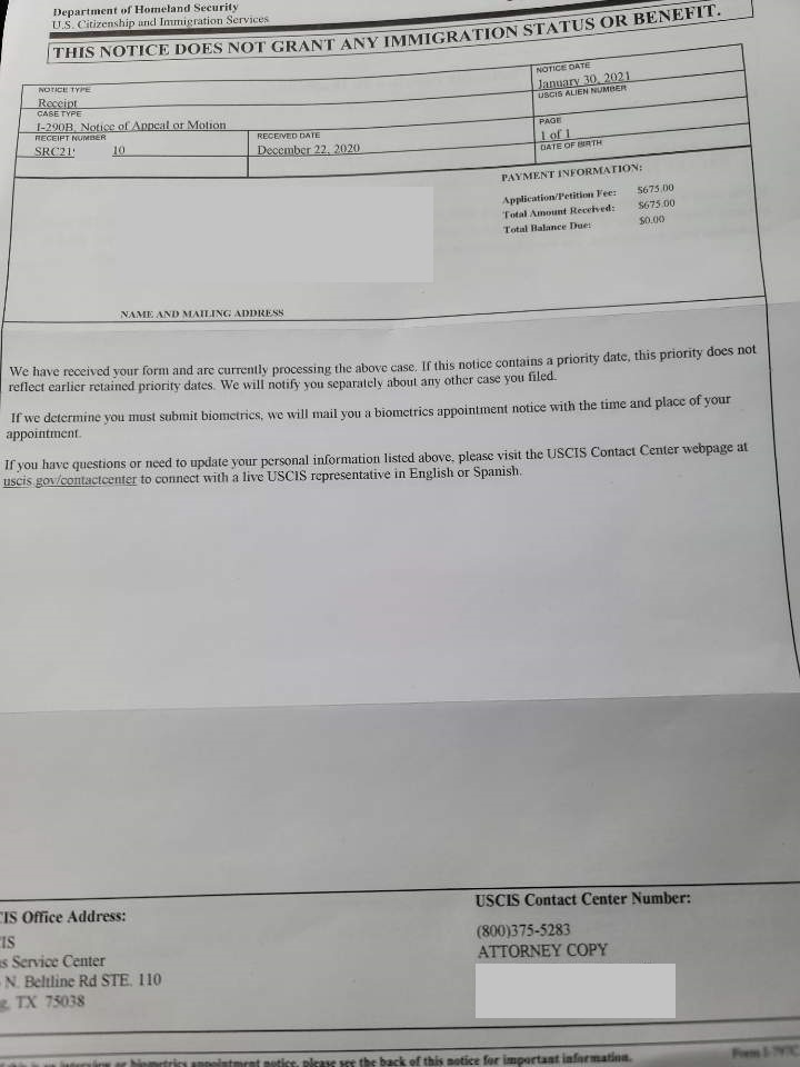 Sau khi hồ sơ nhận thông báo ý định từ chối, đơn I-290B được nộp để kháng cáo.