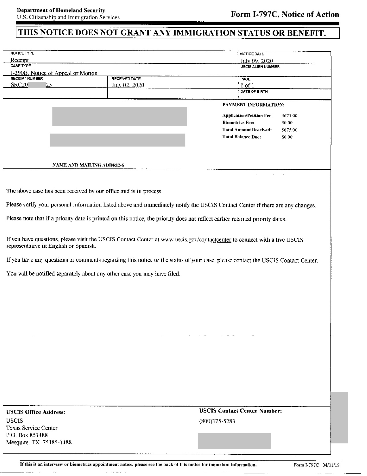 << Thông báo tiếp nhận Đơn I-290B ( kháng cáo) lần thứ nhất>>