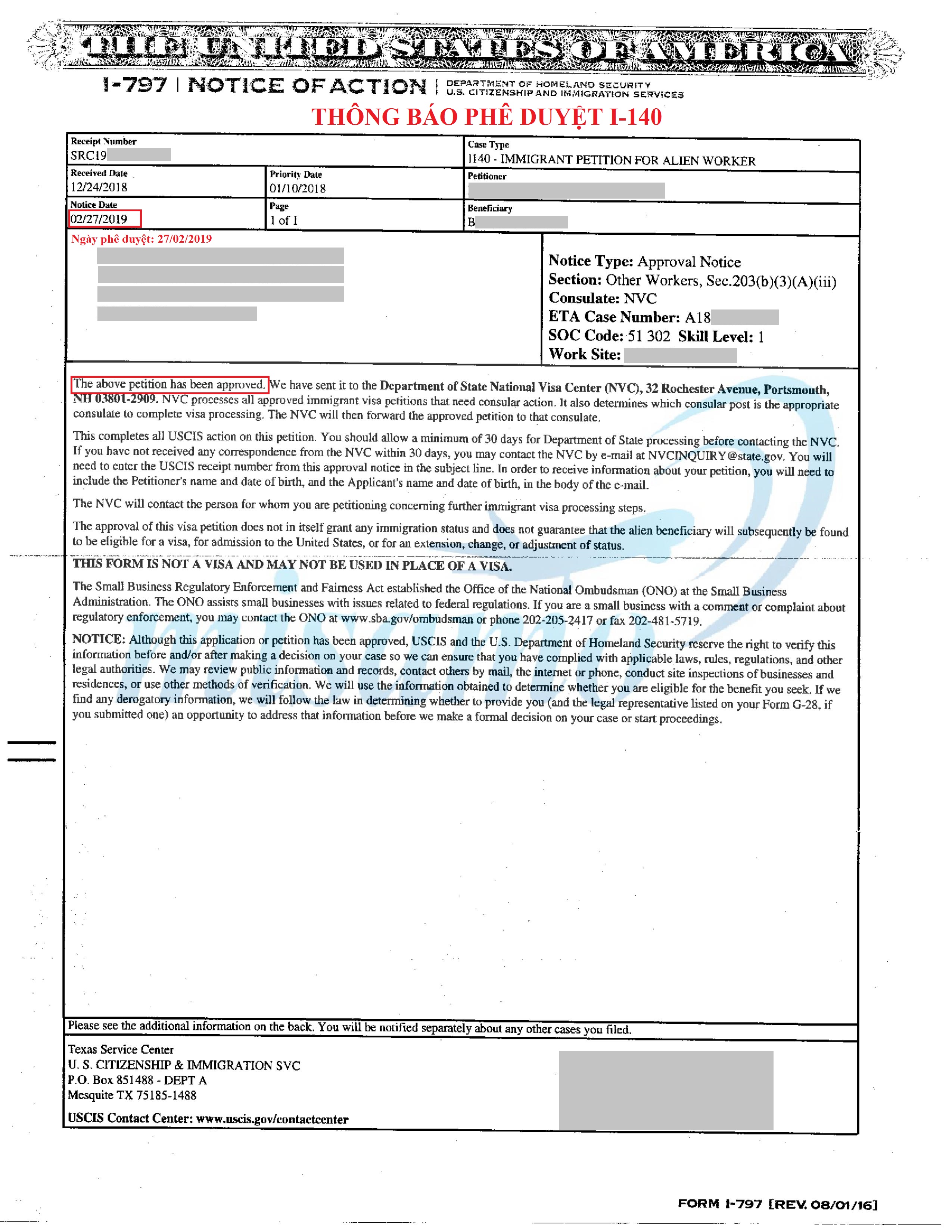 Sở Di Trú tiếp nhận đơn xin định cư I-140 ngày 24/12/2018 và đến ngày 27/02/2019 Sở Di Trú chính thức phê duyệt đơn. Misamo luôn nỗ lực hết mình để mang đến Thẻ Xanh cho quý khách hàng.