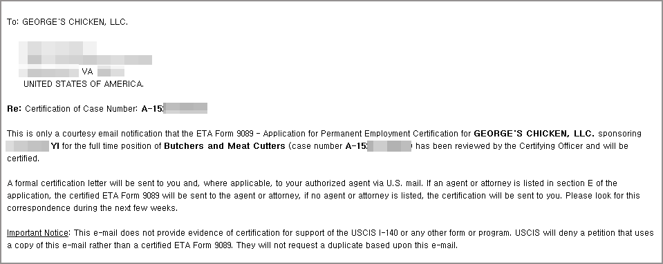 Thông qua công ty tuyển dụng George's (vị trí chế biến gà) và Abbyland (vị trí chế biến xúc xích), khách hàng Lee** của Misamo đã nộp song song 2 hồ sơ tới hai công ty tuyển dụng trên vào tháng 09/2015 và đã được xét duyệt CNLĐ chỉ trong vòng 5 tháng. Khách hàng Lee dự định sẽ nộp ngay đơn I-140. Misamo kỳ vọng rằng 100% khách hàng khác cũng sẽ sớm được xét duyệt. Chúng tôi sẽ nỗ lực hết sức để toàn bộ quý khách hàng đều nhận được thẻ Xanh.