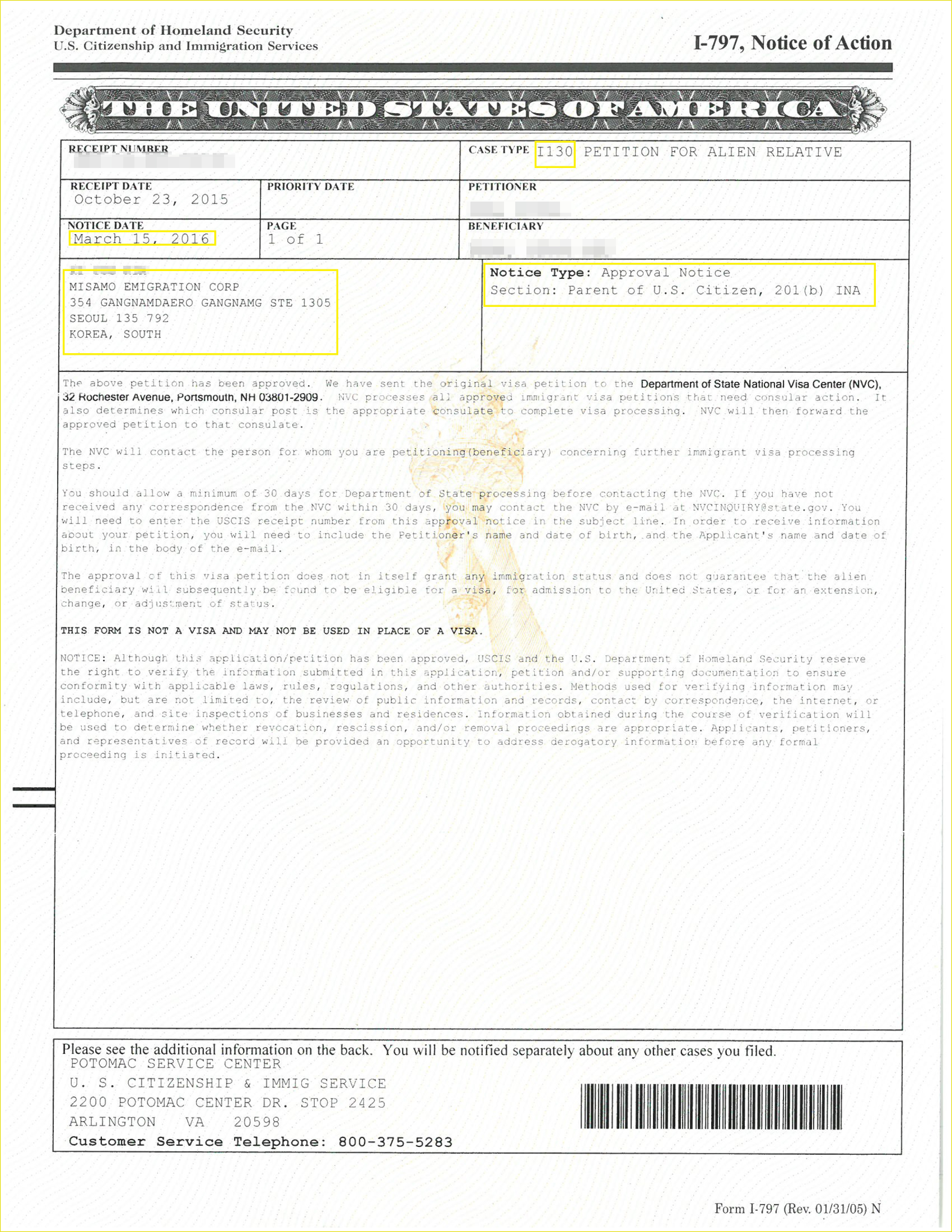 Ngày được phê duyệt đơn I-130: 15/06/2016