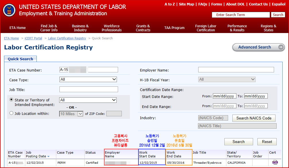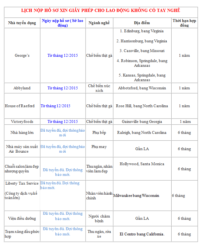 Toàn bộ khách hàng ứng tuyển vào vị trí thu ngân (Cashier, hợp đồng 6 tháng ) tại các chuỗi beauty salon làm đẹp tại Santa Monica và Hollywood tháng 12/2014 đều nhận được GPLĐ. Tỷ lệ nhận được GPLĐ 100%, không có trường hợp nào bị thanh tra. Không những thế, toàn bộ khách hàng nộp đơn xin GPLĐ cho vị trí làm việc tại nhà máy Rose Hill, bang North Carolina của House of Reaford vào tháng 12/2014 và tháng 1/2015 vừa qua đều nhận được GPLĐ và dự tính 100% khách hàng nộp đơn vào tháng 2/2015 sẽ nhận được GPLĐ trong một ngày không xa.