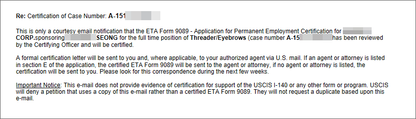 Hồ sơ ứng tuyển cho vị trí tỉa lông mày bằng chỉ tại các chuỗi salon làm đẹp nhượng quyền, tất cả đều được xét duyệt CNLĐ, không có trường hợp nào bị thanh tra. Tháng 05/2015, hai khách hàng của Misamo đã nộp đơn tại Bộ lao động và đến ngày 01/12/2015 cả hai khách hàng đều đã được xét duyệt CNLĐ. Bí quyết để 100% hồ sơ được xét duyệt đó là công ty tuyển dụng độc quyền của Misamo chỉ nộp lên Bộ lao động cho những hồ sơ phù hợp, hội đủ yêu cầu và đồng thời cũng là công ty tuyển dụng không bảo lãnh nhận thẻ Xanh trong nhiều năm qua. Thêm vào đó, luật sư tư vấn định cư của Misamo đã chuẩn bị hồ sơ rất cẩn thận và biết cách xử lý mọi tình huống.