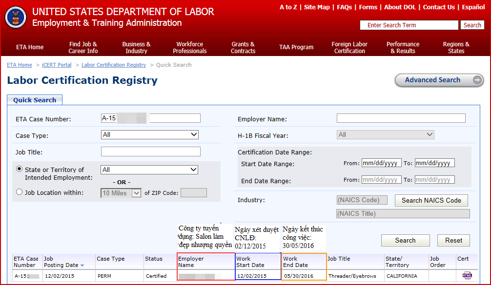 <Kết quả tìm kiếm trên trang web của Bộ lao động – Khách hàng Choi nộp đơn vào tháng 05/2015, đến tháng 12/2015 được xét duyệt CNLĐ>