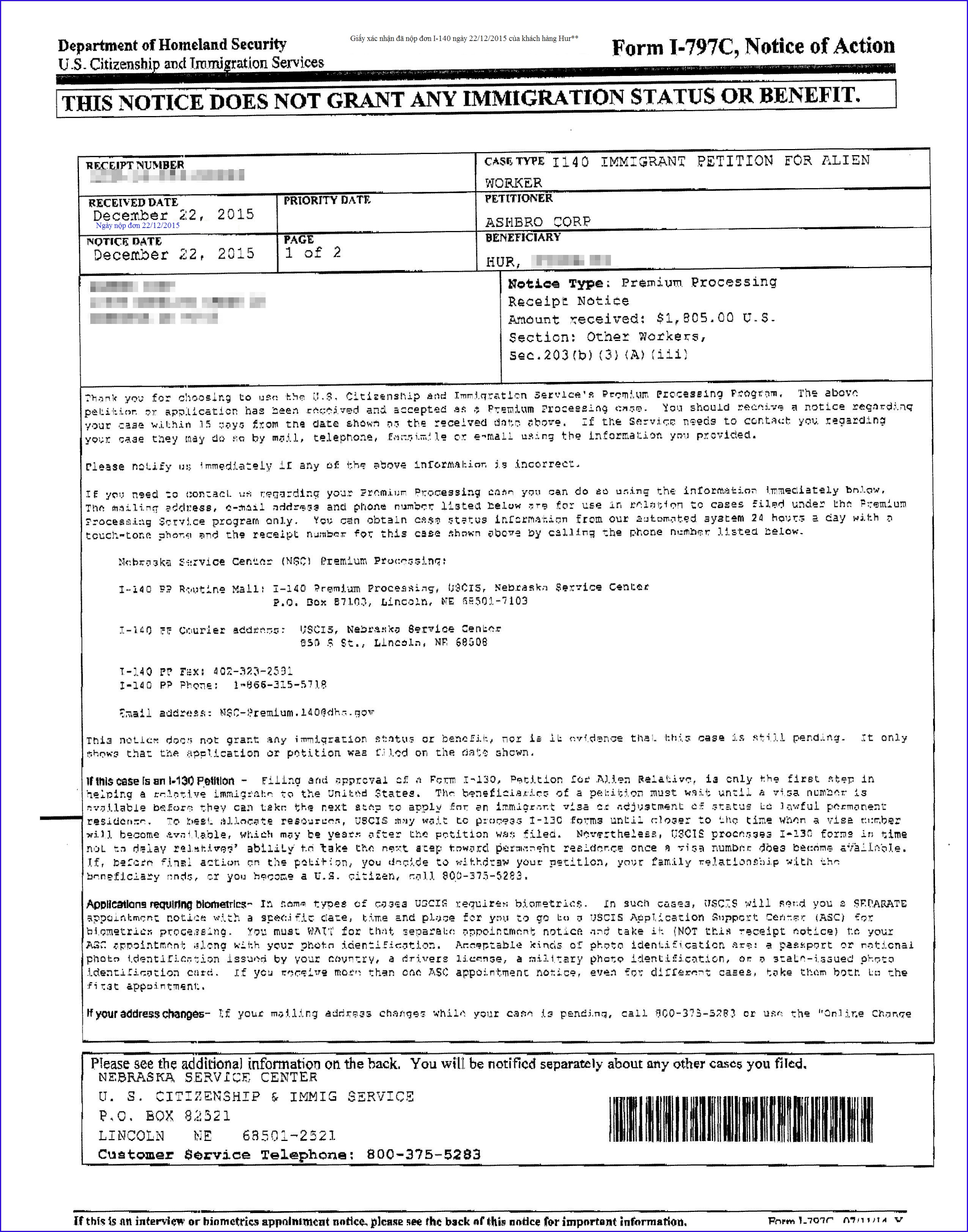 Giấy xác nhận đã nộp đơn I-140 ngày 22/12/2015 của khách hàng Hur**