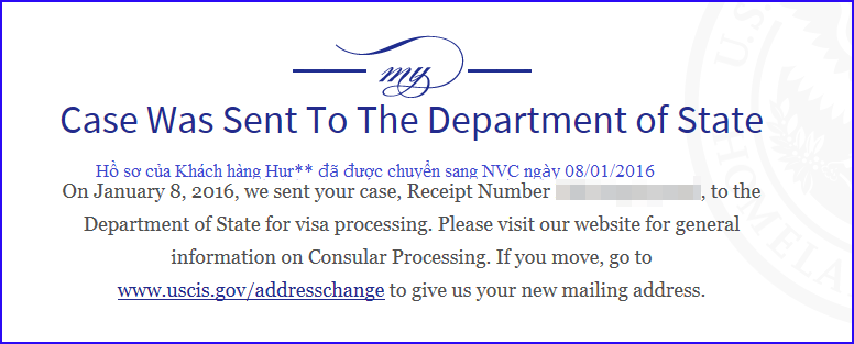 Kết quả tìm kiếm tại Sở di trú (USCIS) – hồ sơ của khách hàng Hur** đã được chuyển sang NVC ngày 08/01/2016