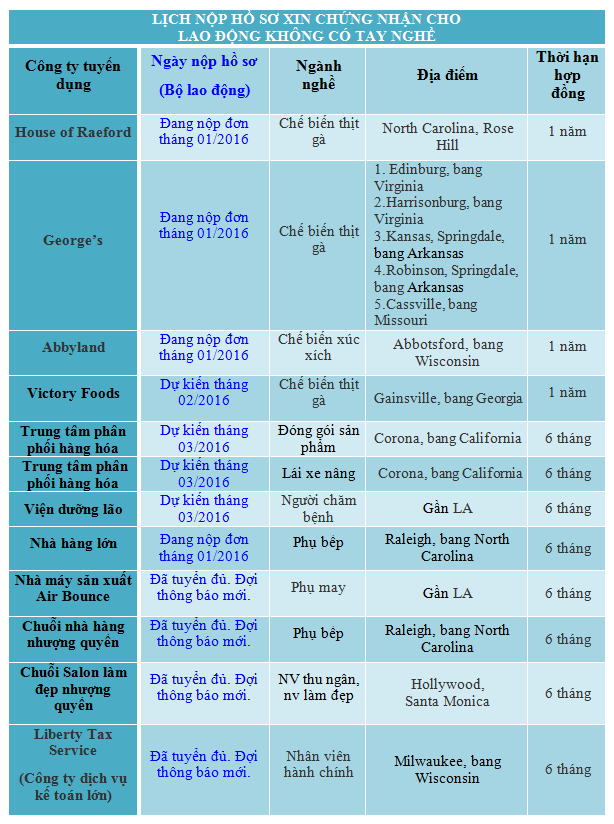 Toàn bộ khách hàng ứng tuyển vào vị trí thu ngân (Cashier, hợp đồng 6 tháng ) tại các chuỗi beauty salon làm đẹp tại Santa Monica và Hollywood tháng 12/2014 đều nhận được CNLĐ. Tỷ lệ nhận được CNLĐ 100%, không có trường hợp nào bị thanh tra .Toàn bộ khách hàng nộp đơn lên Bộ Lao động vào tháng 12/2014 và tháng 01/2015 cho vị trí làm việc tại House of Raeford (North Carolina, Rose Hill) đã nhận được CNLĐ, đến tháng 02/2015100% khách hàng đang được xét duyệt.