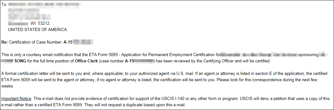 Khách hàng Song** của Misamo đã nộp đơn lên Bộ Lao động vào tháng 06/2015 cho vị trí nhân viên thu ngân và hỗ trợ văn phòng  của công ty dịch vụ kế toán chuyển nhượng lớn Liberty Tax Service (CPA) tại Milwaukee, Wisconsin. Và đến tháng 01/2016 đã được xét duyệt CNLĐ. Khách hàng dự định sẽ nộp ngay đơn I-140.