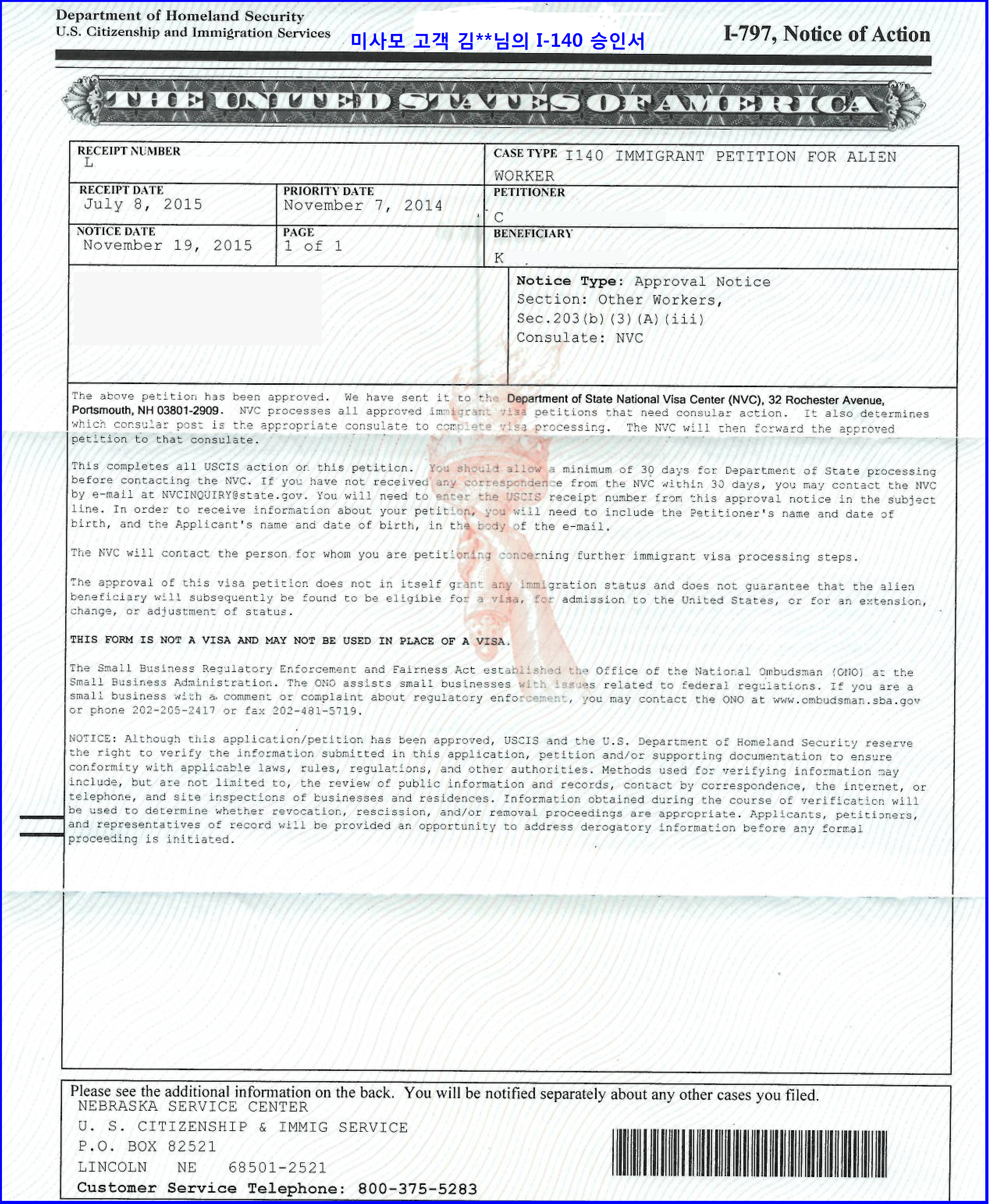 <Chứng nhận duyệt đơn I-140 tiếp nhận thông thường của anh Kim**- khách hàng MISAMO>