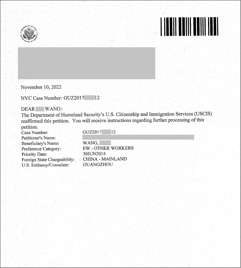 Trong tháng 11.2022, Misamo có 02 khách hàng EW3 ( Lao động định cư không tay nghề) người Trung Quốc đã được chấp thuận sau khi trải qua quá trình TP kiểm tra hồ sơ ( Reaffirmed: tái xác nhận) tại Sở Di Trú Hoa Kỳ