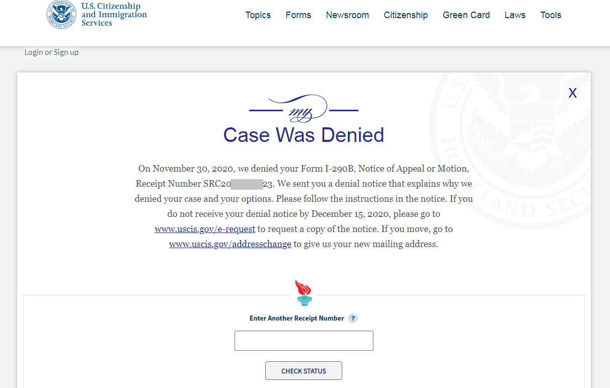 Sau khi hồ sơ nhận thông báo ý định từ chối, đơn I-290B được nộp để kháng cáo.
