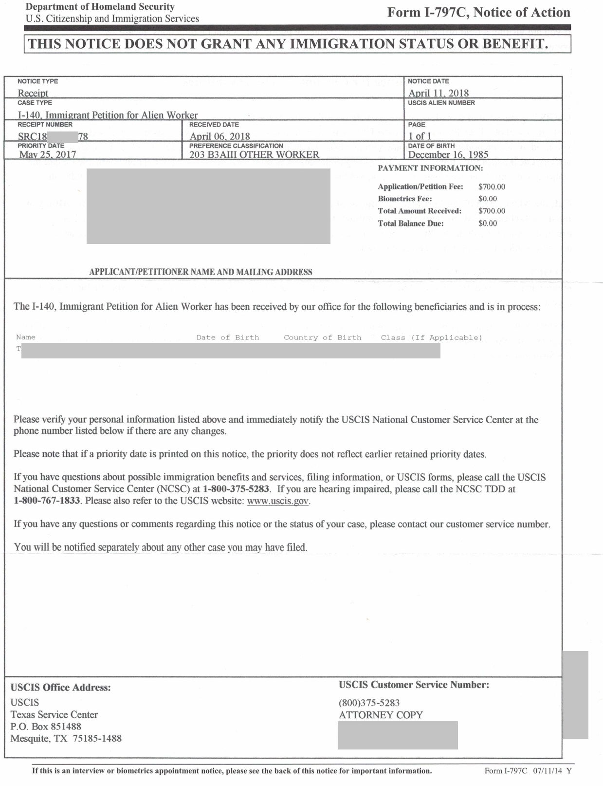 <<Thông báo tiếp nhận hồ sơ I-140>>