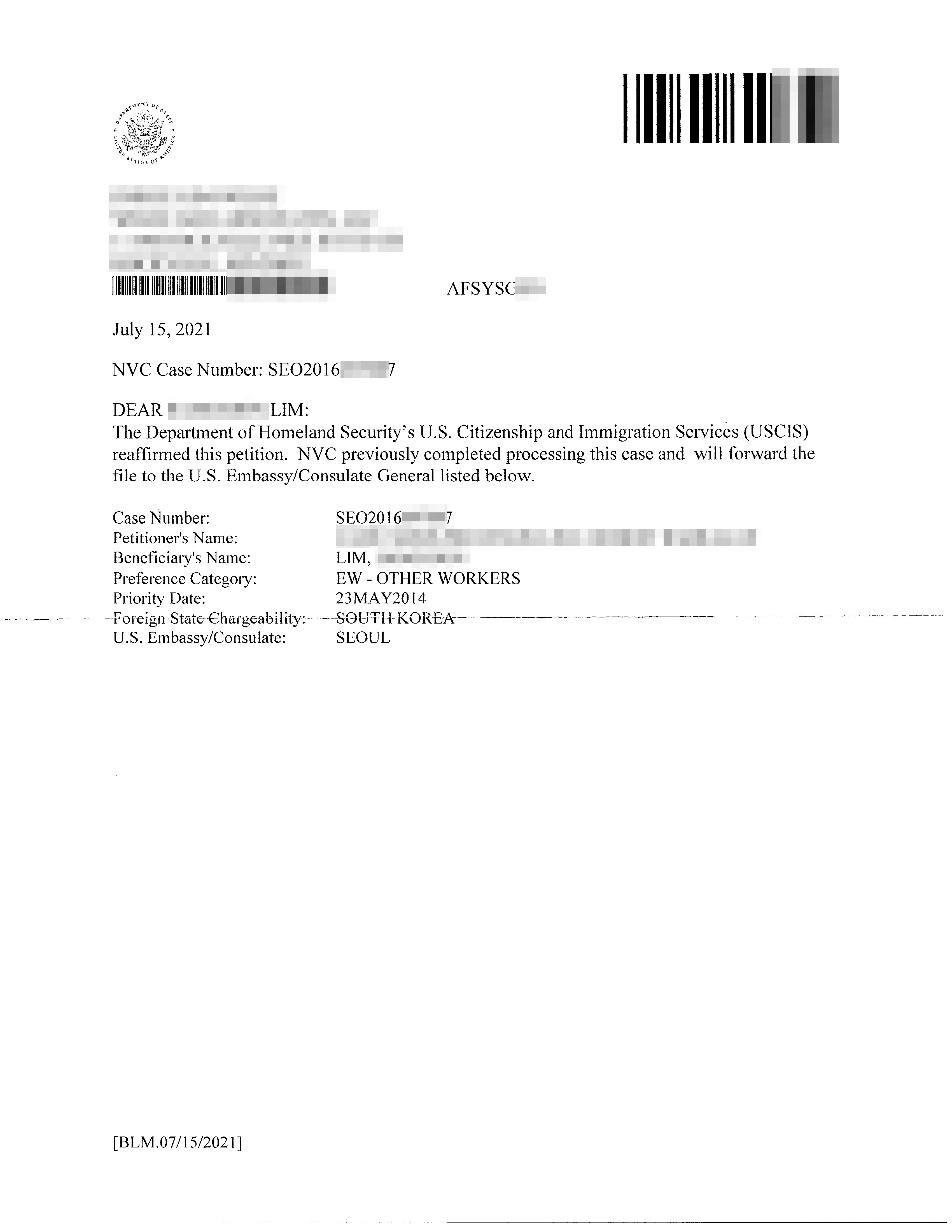 Hồ sơ được tái xác nhận sau thanh tra của khách hàng người Hàn được chuyển đến Tổng Lãnh Sự Quán Hoa Kỳ để đặt lịch phỏng vấn