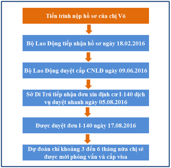 Bộ Lao Động Hoa Kỳ tiếp nhận hồ sơ của chị Võ ngày 18 tháng 02 năm 2016, chỉ 4 tháng sau chị được cấp CNLĐ vào ngày 09 tháng 06 năm 2016. Sở Di Trú tiếp nhận đơn xin định cư I-140 dịch vụ duyệt nhanh của chị Võ khách hàng MISAMO thông qua công ty House of Raeford ngày 05 tháng 08 năm 2016, và chị Võ đã được duyệt đơn ngày 17 tháng 08 năm 2016. Dự đoán rằng chị sẽ được mời phỏng vấn và nhận visa trong năm nay hoặc đầu năm sau. Cám ơn chị Võ đã tin tưởng và ủy thác toàn quyền cho MISAMO trong suốt thời gian qua.