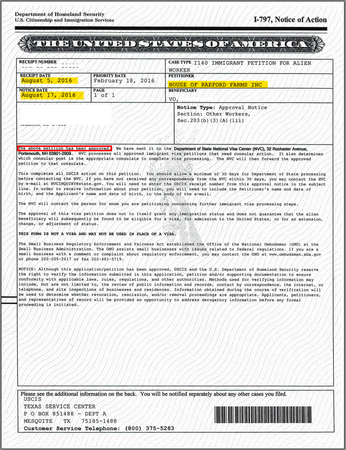 [House of Raeford] 2 KHÁCH HÀNG VIỆT NAM CỦA MISAMO ĐÃ ĐƯỢC DUYỆT VISA ĐỊNH CƯ I-140