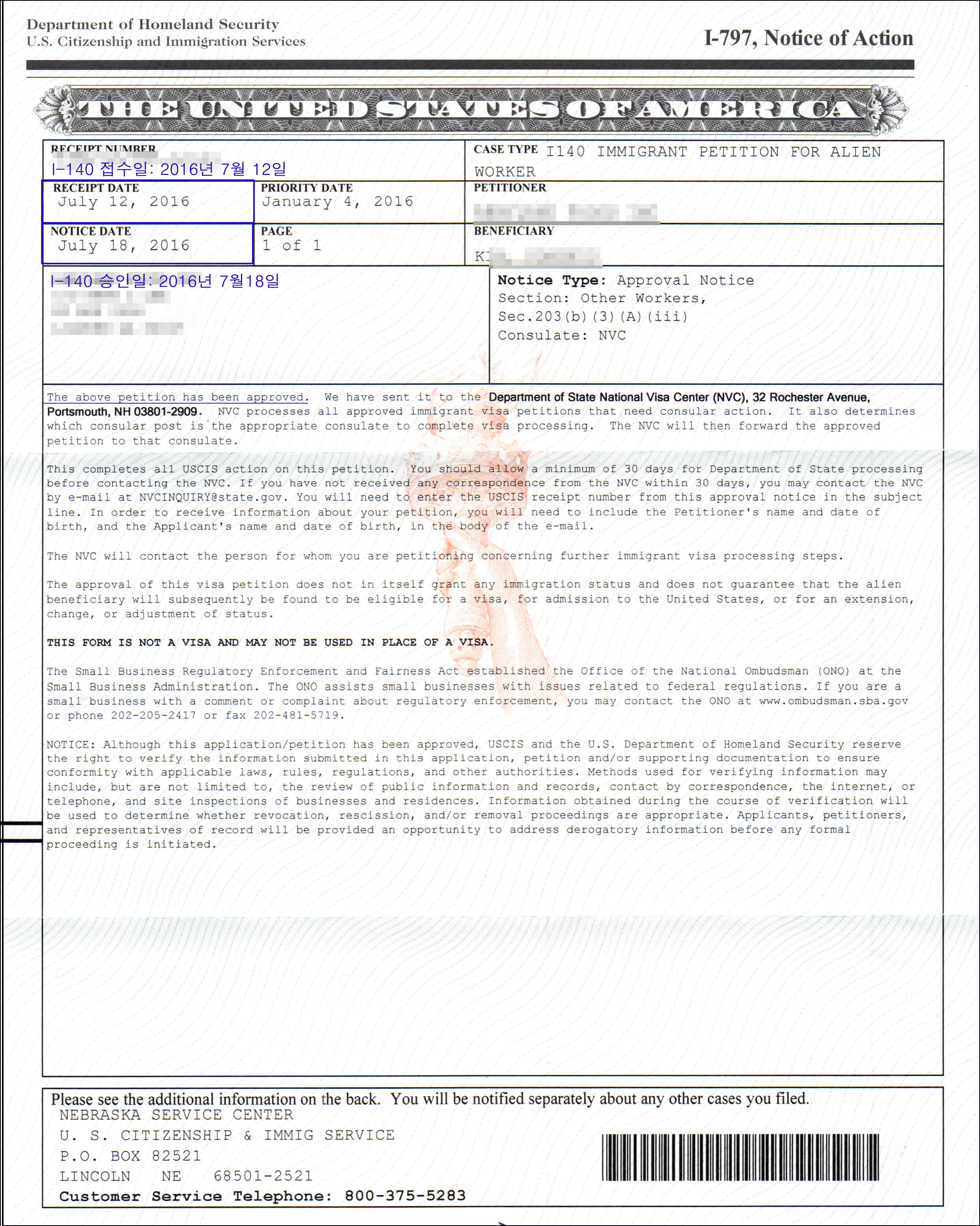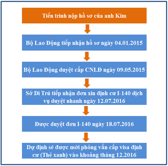Bộ Lao Động đã tiếp nhận hồ sơ của anh Kim khách hàng của MISAMO ngày 1 tháng 04 năm 2015, và anh Kim đã được duyệt cấp CNLĐ ngày 9 tháng 05 năm 2016. Do vướng một số trục trặc mang tính cá nhân mà thủ tục đã bị chậm lại, ngày 12.07.2016 Sở Di Trú đã tiếp nhận đơn xin I-140 dịch vụ duyệt nhanh và chỉ trong 6 ngày đơn I-140 của anh Kim đã được duyệt vào ngày 18.07.2016.