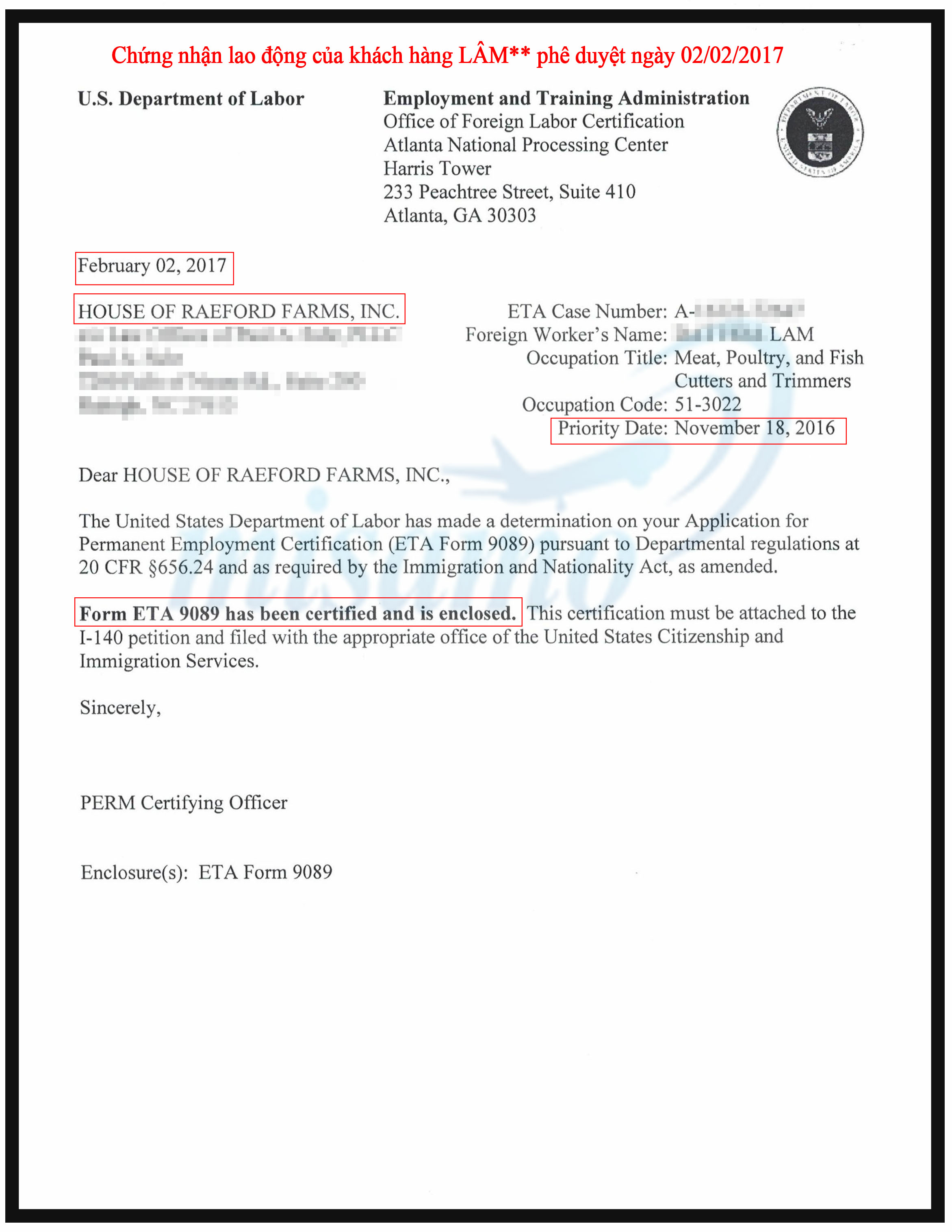 Dưới đây là Chứng Nhận Lao Động của khách hàng Lâm**. Ngày 18/11/2016 anh Lâm** nộp đơn lên Bộ Lao Động và đến ngày 02/02/2017 anh đã được phê duyệt Chứng Nhận Lao Động. Như vậy, chỉ trong vòng 2 tháng rưỡi anh Lâm** đã nhận được Chứng Nhận Lao Động. Misamo luôn nỗ lực hết sức để có thể mang lại thẻ xanh cho quý khách hàng.