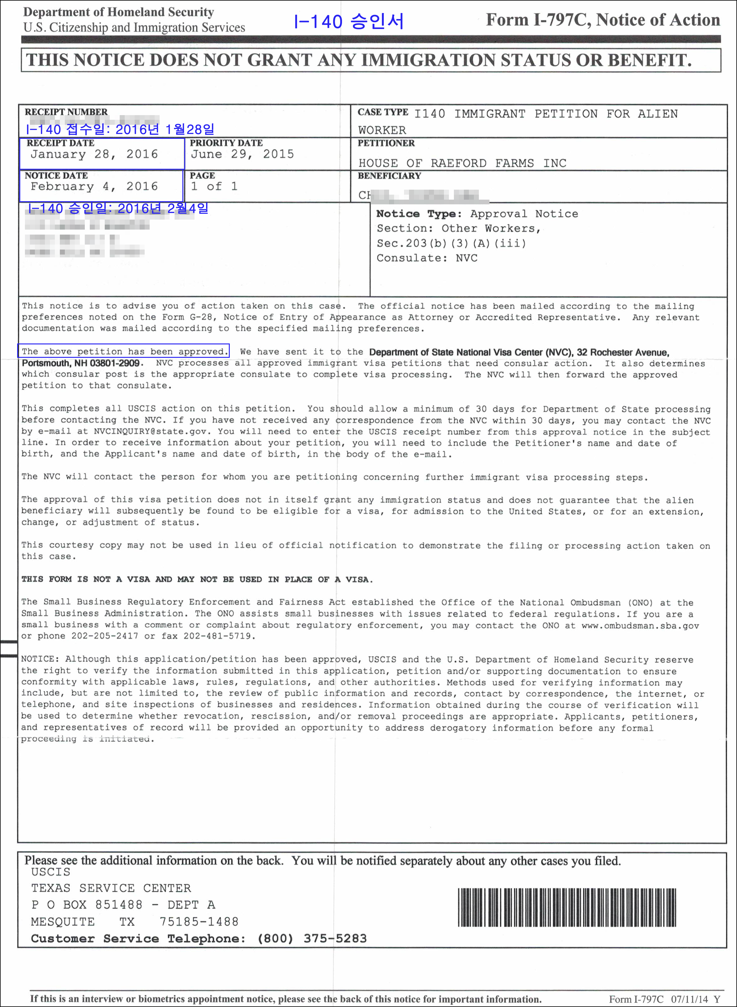 <Đơn I-140 của quý khách hàng Choi được duyệt>