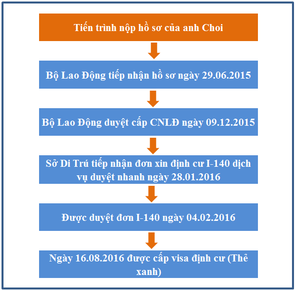Bộ Lao Động đã tiếp nhận hồ sơ của anh Choi từ ngày 29 tháng 6 năm 2015, đến ngày 28 tháng 1 năm 2016 anh đã được tiếp nhận đơn xin định cư I-140 dịch vụ duyệt nhanh và chỉ khoảng 7 ngày sau anh Choi được duyệt. Sau khi đệ trình tất cả giấy tờ thủ tục cho NVC (National Visa Center), ngày 16 tháng 08 năm 2016 anh đã đậu phỏng vấn visa định cư tại Đại Sứ Quán. Cám ơn anh Choi đã tin tưởng và ủy thác toàn quyền cho MISAMO trong suốt thời gian qua. Anh Choi sẽ đến Mỹ sau khi nhận visa định cư.