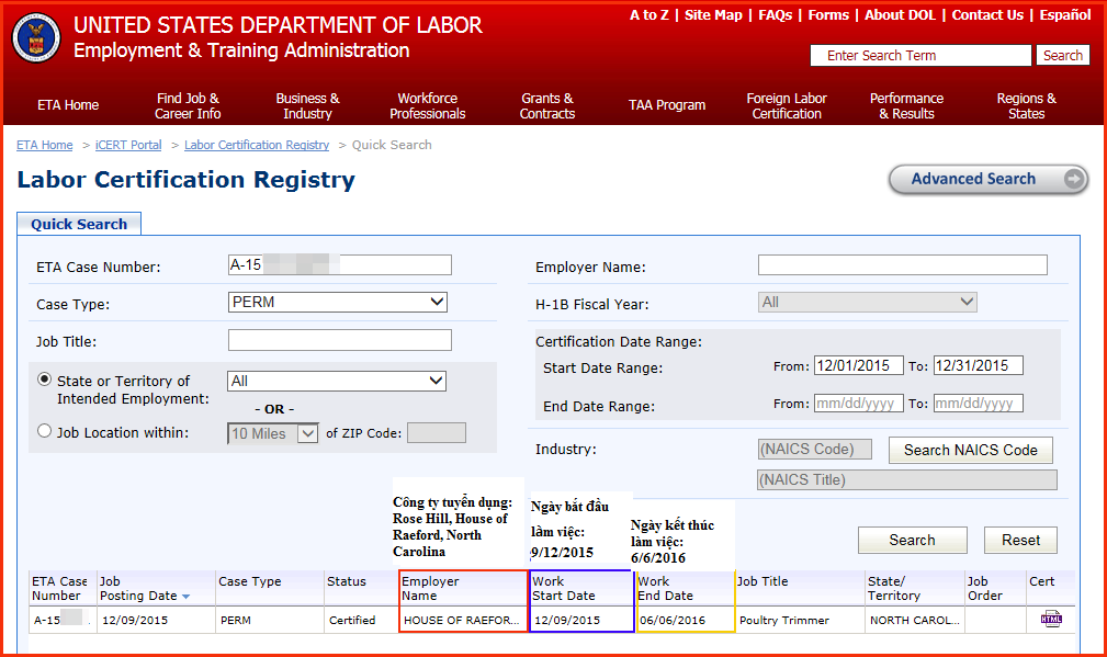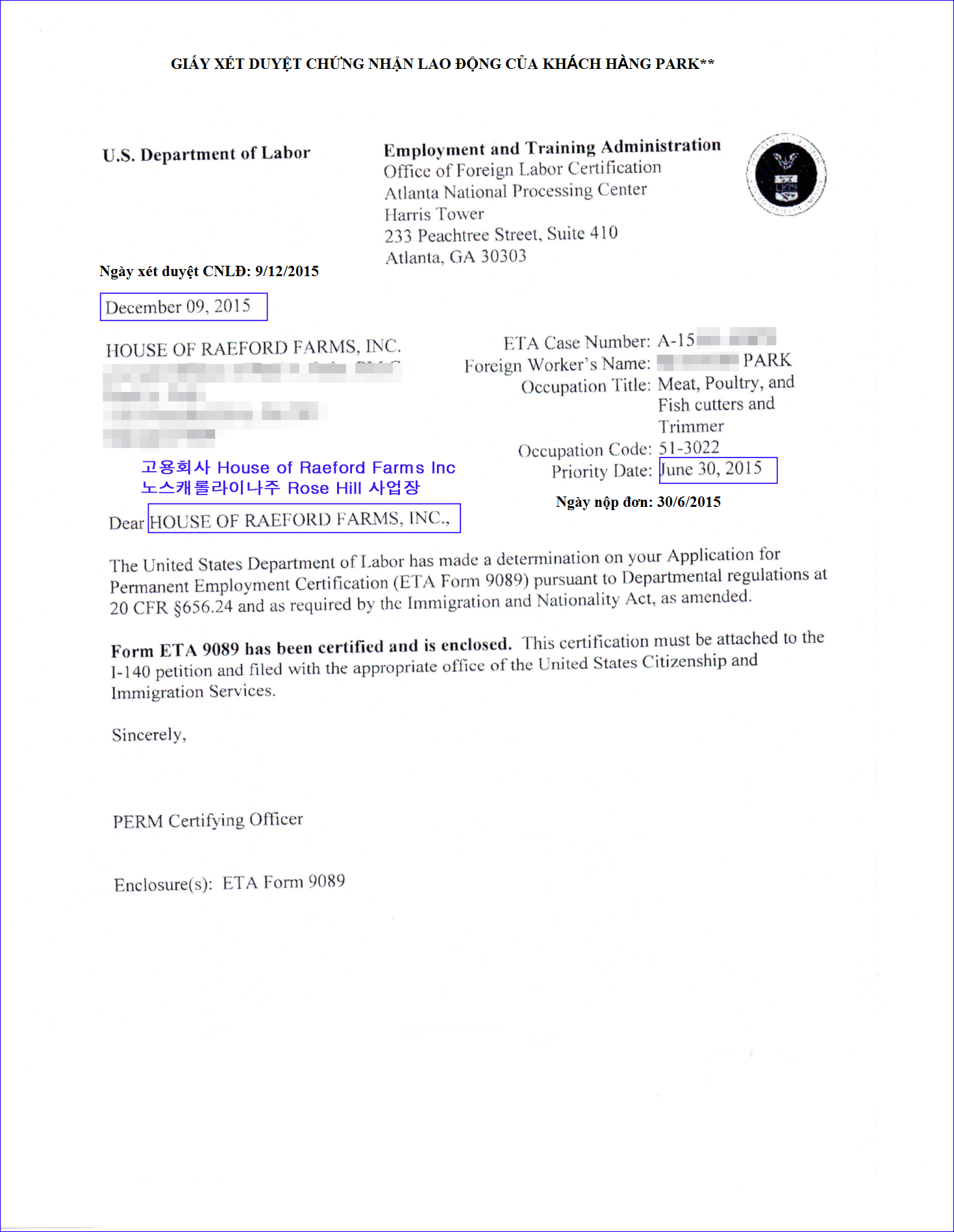 Thông qua House of Raeford, vào ngày 30/6/2015, khách hàng Park** của Misamo đã nộp đơn lên Bộ lao động Mỹ diện lao động không tay nghề, và đến ngày 9/12/2015 đã được xét duyệt CNLĐ.