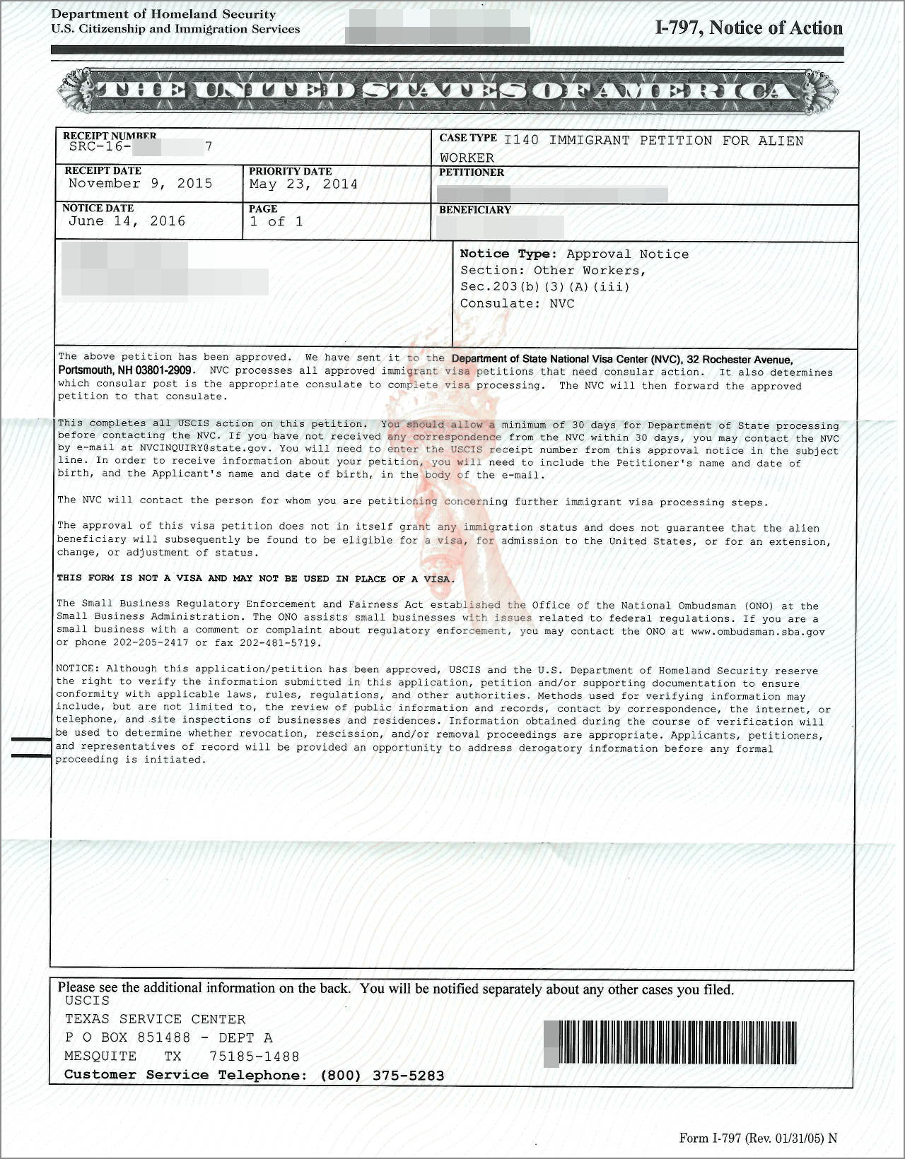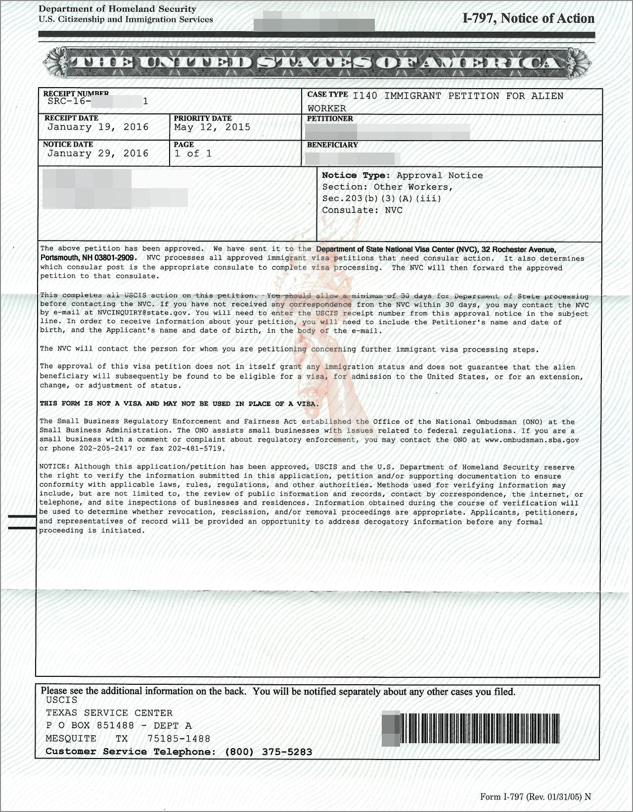Khách hàng SRC16*1 đã được chấp thuận đơn I140 vào ngày 29.01.2016 và bị thanh tra (TP).