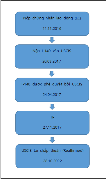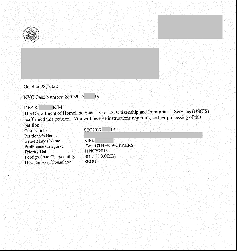 Ngày 28.10.2022, khách hàng KIM (SRC17*776)- một khách hàng EW3 ( Lao động định cư không tay nghề) người Hàn Quốc của công ty Misamo đã được chấp thuận sau khi trải qua quá trình TP kiểm tra hồ sơ ( Reaffirmed: tái xác nhận) tại Sở Di Trú Hoa Kỳ