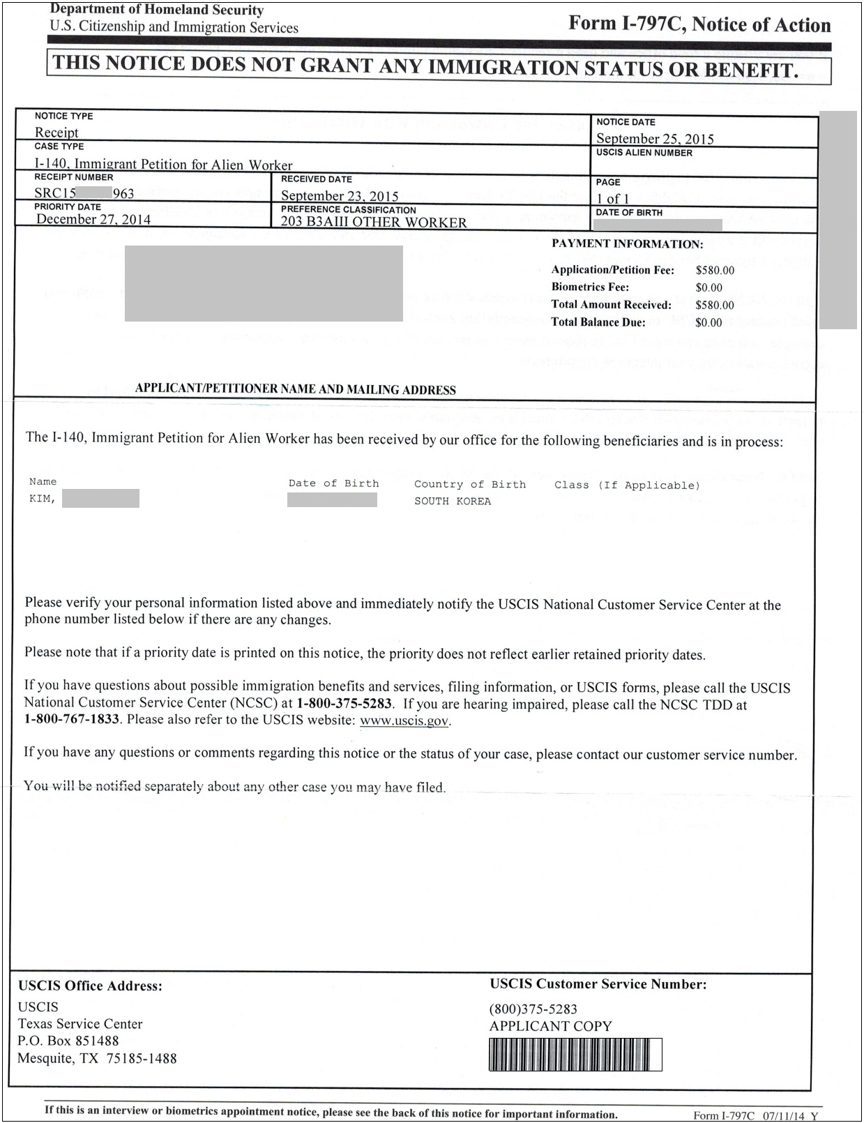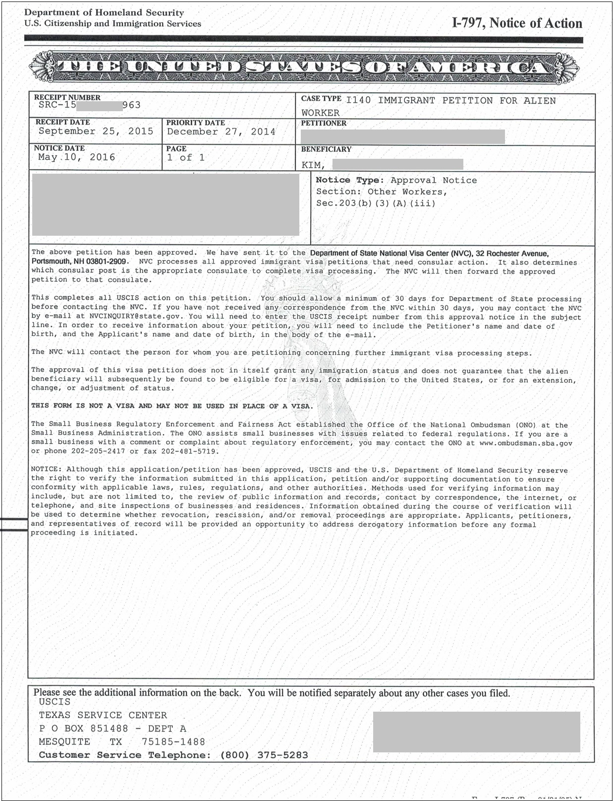 Khách hàng KIM (SRC15**963) có ngày ưu tiên là 27.12.2014. Nộp đơn I-140 ngày 23.09.2015, đơn I-140 được phê duyệt vào ngày 10.05.2016. Hồ sơ của khách hàng KIM bị trả về USCIS thanh tra vào ngày 28.11.2017