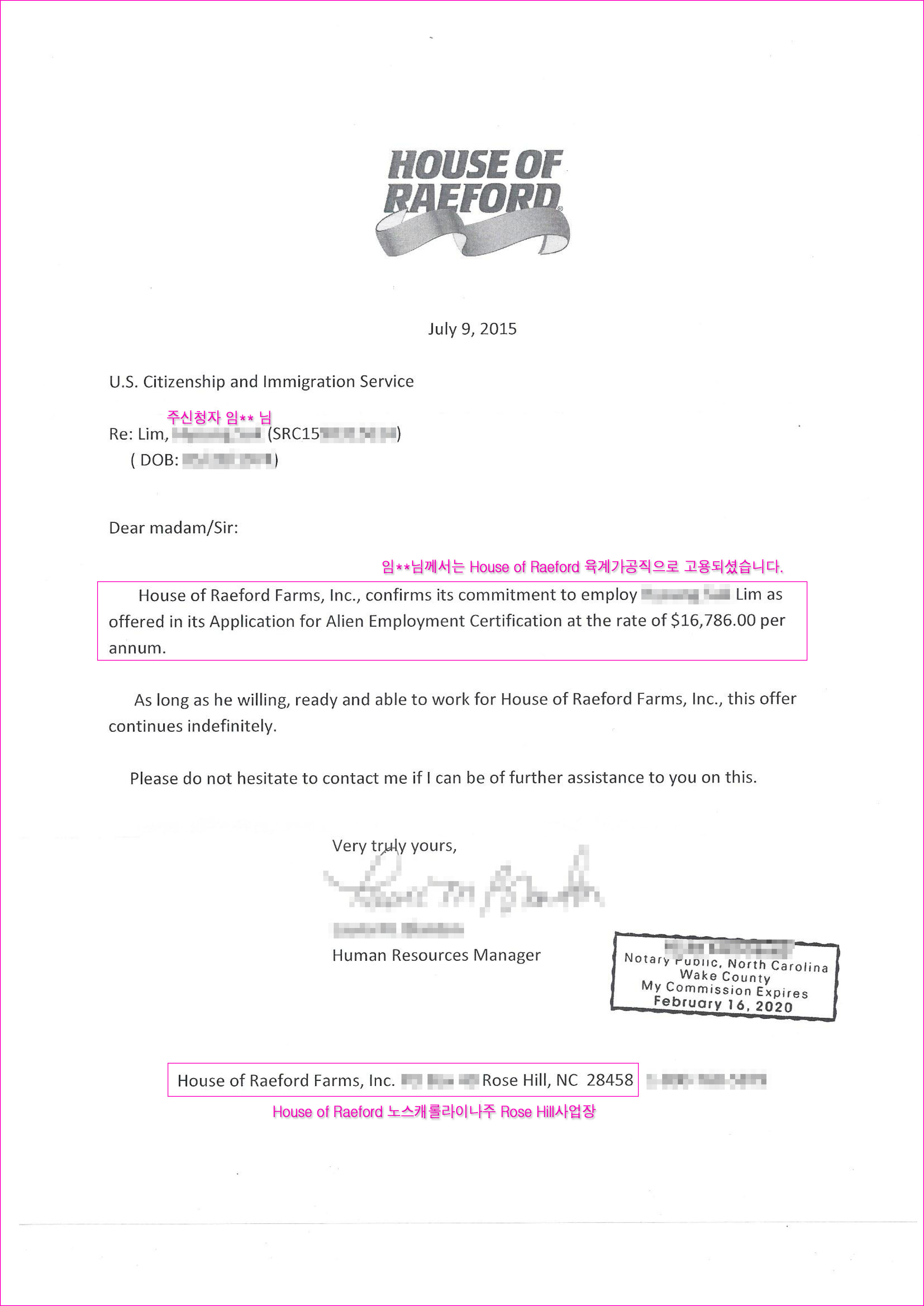 Quý khách hàng Im** đã quyết định ký hợp đồng sau khi được người quen – là khách hàng của Misamo và đã nhận được thường trú nhân qua Misamo – giới thiệu. Khách hàng Im bắt đầu nộp hồ sơ ngày 14/6/2014 cho vị trí chế biến thịt gà và đúng 1 năm 6 tháng sau đã nhận được thường trú nhân. Do khách hàng đang ở Mỹ bằng visa học sinh nên sau khi nhận kết quả duyệt đơn I-140, Misamo đã nộp đơn I-485 (thay đổi trạng thái cư trú) cho khách hàng.