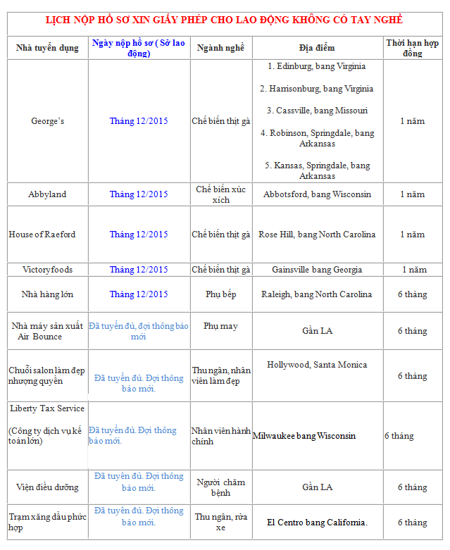 Toàn bộ khách hàng ứng tuyển vào vị trí thu ngân (Cashier, hợp đồng 6 tháng ) tại các chuỗi beauty salon làm đẹp tại Santa Monica và Hollywood tháng 12/2014 đều nhận được GPLĐ. Tỷ lệ nhận được GPLĐ 100%, không có trường hợp nào bị thanh tra. Không những thế, toàn bộ khách hàng nộp đơn xin GPLĐ cho vị trí làm việc tại nhà máy Rose Hill, bang North Carolina của House of Reaford vào tháng 12/2014 và tháng 1/2015 vừa qua đều nhận được GPLĐ và dự tính 100% khách hàng nộp đơn vào tháng 2/2015 sẽ nhận được GPLĐ trong một ngày không xa.