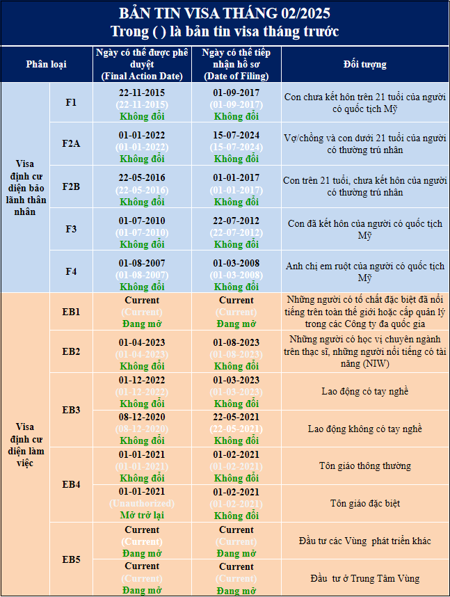 Theo bản tin visa tháng 02/2025 được công bố ngày 14/01/2025, so với tháng trước, không có sự thay đổi nào ở tất cả các diện định cư ngoại trừ ngày ưu tiên phê duyệt của các hồ sơ tôn giáo đặc biệt được mở trở lại.