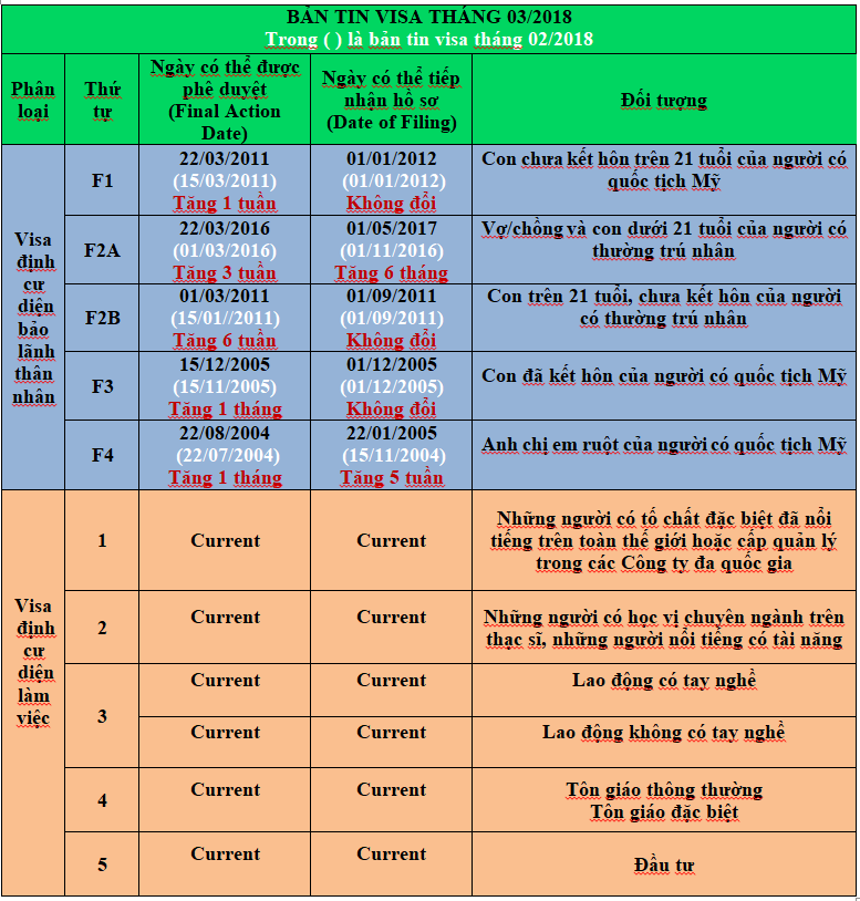 Theo bản tin visa tháng 03 được công bố ngày 12/02 vừa qua, tất cả các diện định cư làm việc đều có ngày phê duyệt (Filing Action Date) và ngày tiếp nhận hồ sơ (Filing Date) mở.