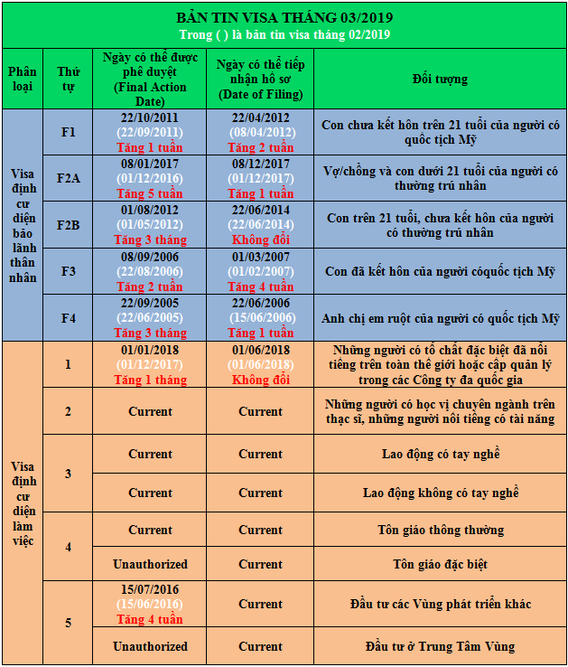 Theo bản tin visa tháng 03/2019 được công bố ngày 15/02 vừa qua, tất cả các diện định cư làm việc đều có ngày tiếp nhận hồ sơ (Filing Date) mở trừ diện EB1, ngày ưu tiên không đổi so với tháng 2 là: 01/06/2018