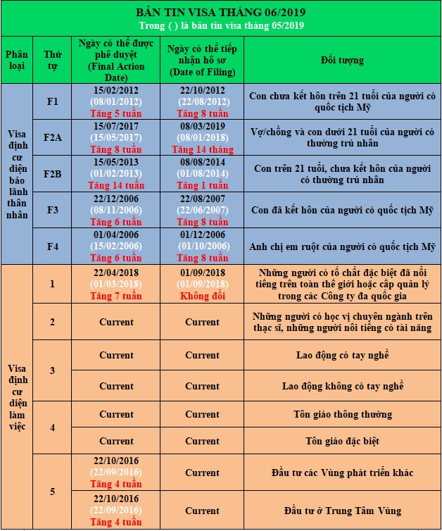 Theo bản tin visa tháng 06/2019 được công bố ngày 15/05, tất cả các diện định cư làm việc đều có ngày tiếp nhận hồ sơ (Filing Date) mở trừ diện EB1, ngày ưu tiên không đổi so với tháng 5 là: 01/09/2018