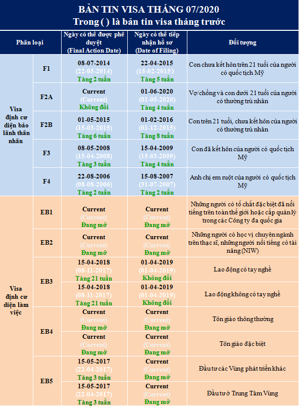 Theo bản tin visa tháng 07/2020 được công bố ngày 17/6, tất cả các diện định cư làm việc đều có ngày tiếp nhận hồ sơ (Filing Date).
