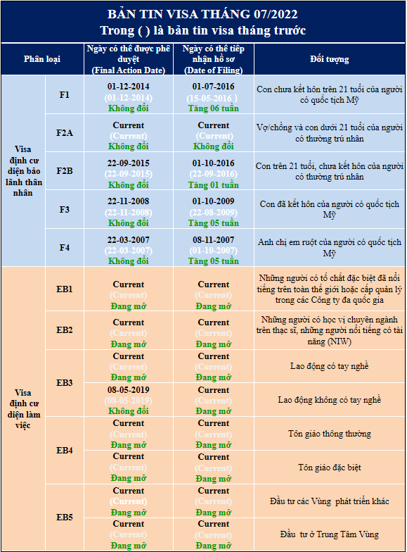 Theo bản tin visa tháng 07/2022 được công bố ngày 14/06/2022, không có sự thay đổi nào so với tháng trước, tất cả các diện định cư làm việc đều có ngày tiếp nhận hồ sơ (Filing Date) đang mở.