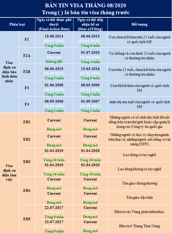Theo bản tin visa tháng 08/2020 được công bố ngày 21/7, tất cả các diện định cư làm việc đều có ngày tiếp nhận hồ sơ (Filing Date).