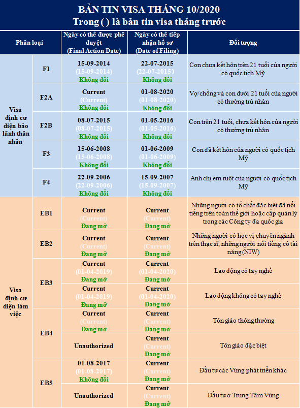 Theo bản tin visa tháng 10/2020 được công bố ngày 25/9, tất cả các diện định cư làm việc đều có ngày tiếp nhận hồ sơ (Filing Date).