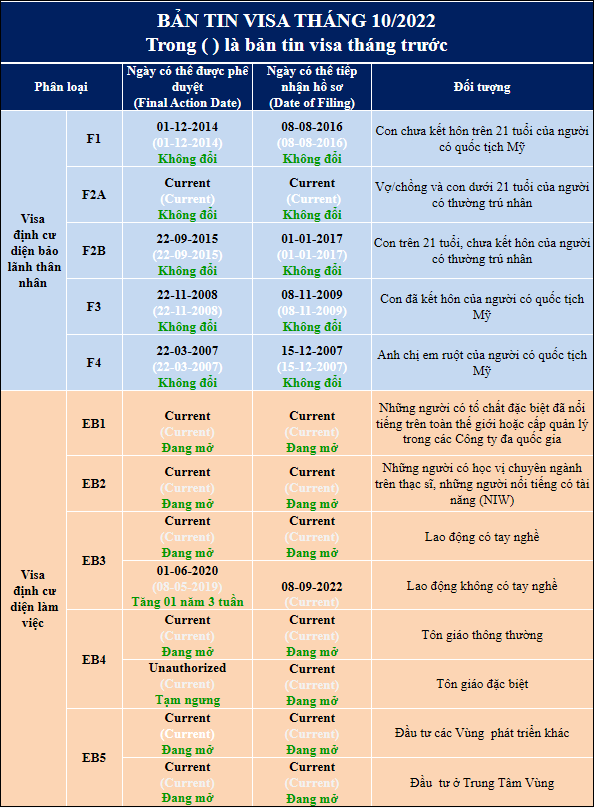 Theo bản tin visa tháng 10/2022 được công bố ngày 08/09/2022, so với tháng trước có sự thay đổi ở diện EB3 lao động không tay nghề và diện EB4 với các hồ sơ tôn giáo đặc biệt , tất cả các diện định cư làm việc khác đều có ngày phê duyệt ( Final Action Date) và ngày tiếp nhận hồ sơ (Date of Filing ) không đổi so với tháng trước với trạng thái đang mở.