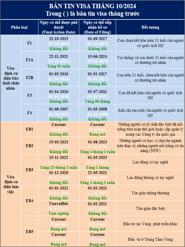 Theo bản tin visa tháng 10/2024 được công bố ngày 12/09/2024, so với tháng trước, có sự thay đổi tăng ở ngày phê duyệt cũng như ngày tiếp nhận hồ sơ của diện EB3- Lao động có tay nghề, Ngày tiếp nhận hồ sơ của các diện EB2, EB3 – Lao động không tay nghề cũng tăng, diện EB4 – Tôn giáo đặc biệt tạm ngưng phê duyệt trong tháng 10/2024.