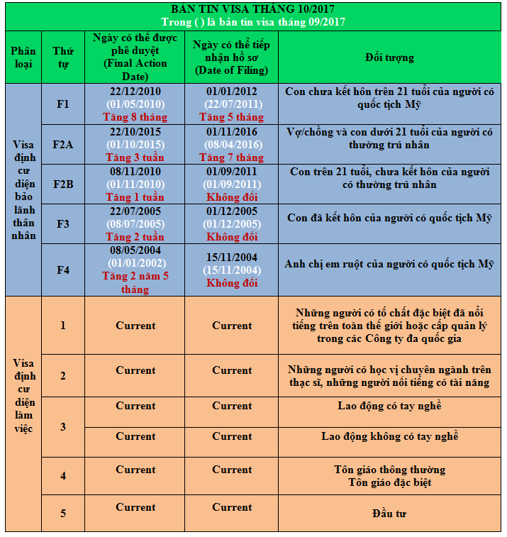 Diện F2A, dành cho đối tượng là vợ/chồng và con dưới 21 tuổi độc thân của thường trú nhân, có ngày ưu tiên phê duyệt là 22/10/2015 tăng 3 tuần so với tháng trước. Ngày tiếp nhận hồ sơ là 01/11/2016, tăng 7 tháng.