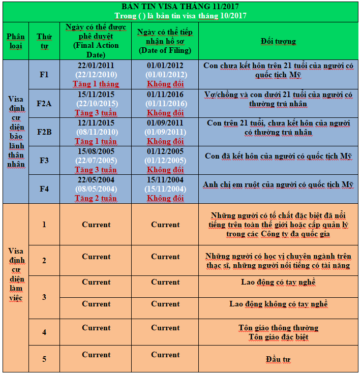 Diện F2A, dành cho đối tượng là vợ/chồng và con dưới 21 tuổi độc thân của thường trú nhân, có ngày ưu tiên phê duyệt là 15/11/2015 tăng 3 tuần so với tháng trước. Ngày tiếp nhận hồ sơ là 01/11/2016, không đổi.