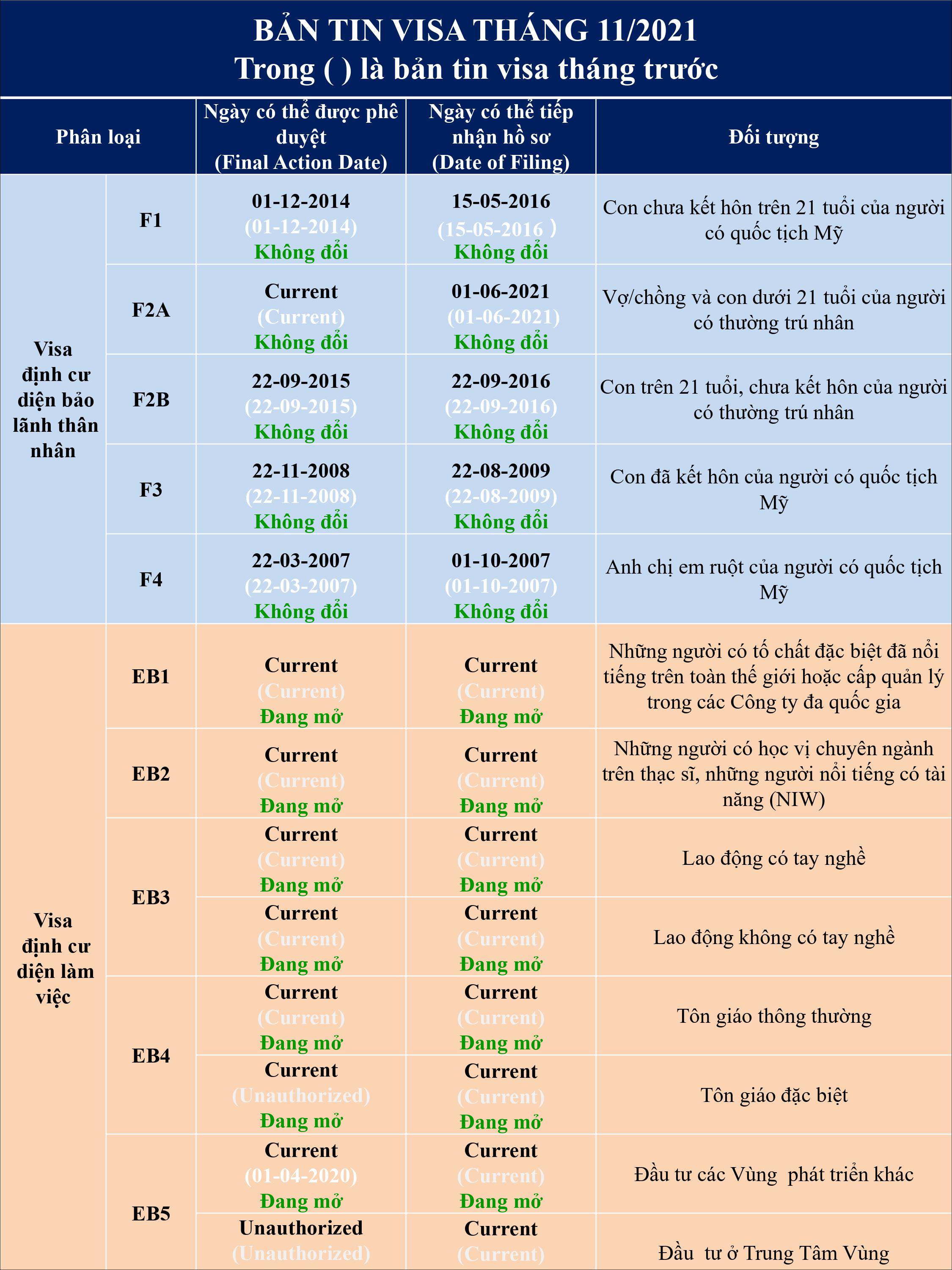 Theo bản tin visa tháng 11/2021 được công bố ngày 15/10/20021, không có nhiều sự thay đổi so với tháng trước,tất cả các diện định cư làm việc đều có ngày tiếp nhận hồ sơ (Filing Date) đang mở.