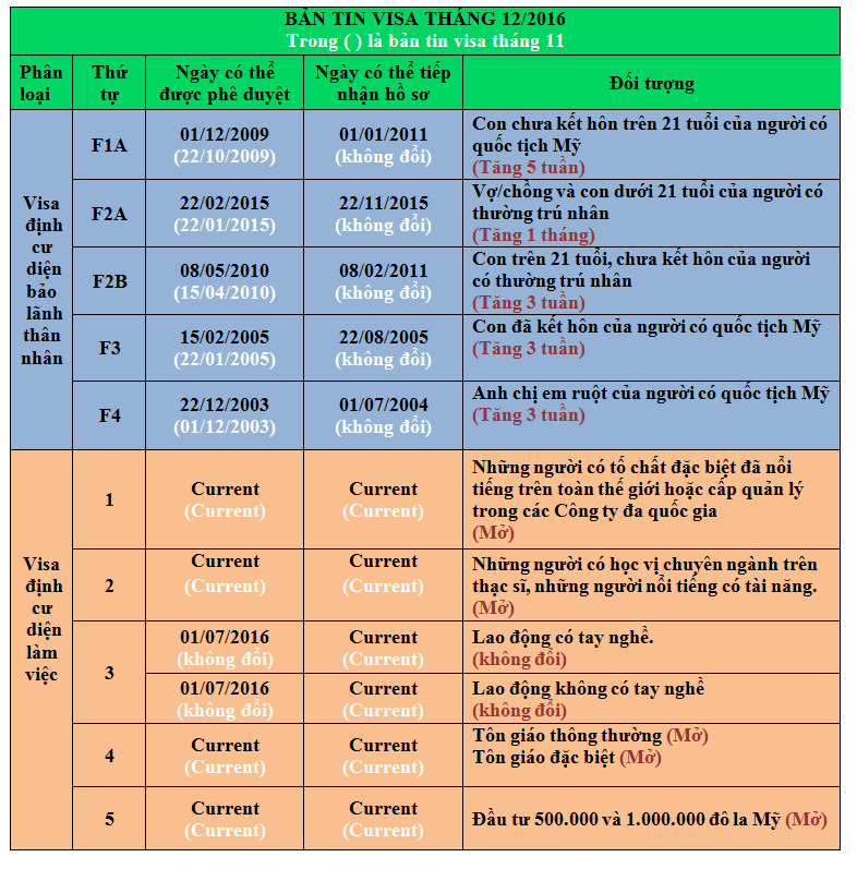 Trong 2 bản tin visa trước, ngày phê duyệt đều tăng 1 tháng nhưng đến tháng 12 này lại giữ nguyên.