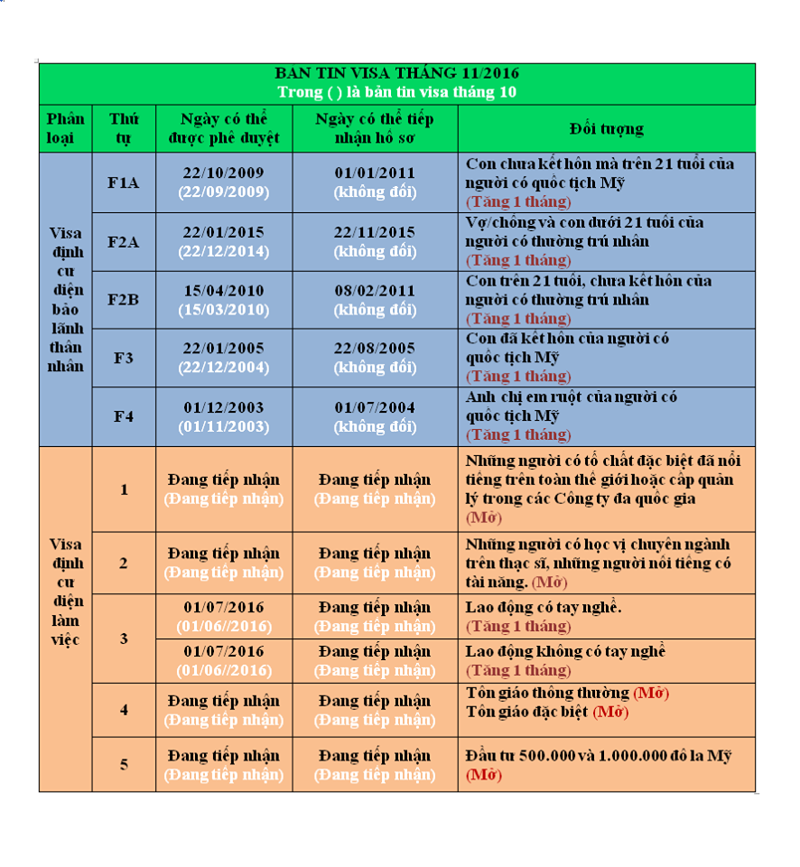 - Đối với diện bảo lãnh thân nhân, ngày phê duyệt toàn bộ tăng 1 tháng. Ngày nộp hồ sơ trong tháng 10 vừa qua diện F1A và F4 có tăng nhanh nhưng sang đến tháng 11 toàn bộ lại tiếp tục đóng băng.