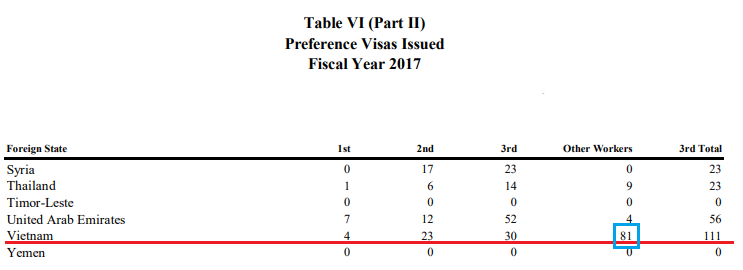 Năm tài khóa 2017 trên thế giới có tổng cộng 2.832 visa diện lao động không tay nghề EB-3 được cấp bao gồm cả trường hợp chuyển đổi tình trạng cư trú I-485 tại Mỹ. Nếu tính riêng trường hợp được cấp visa ngoài lãnh thổ Mỹ là 929 visa.