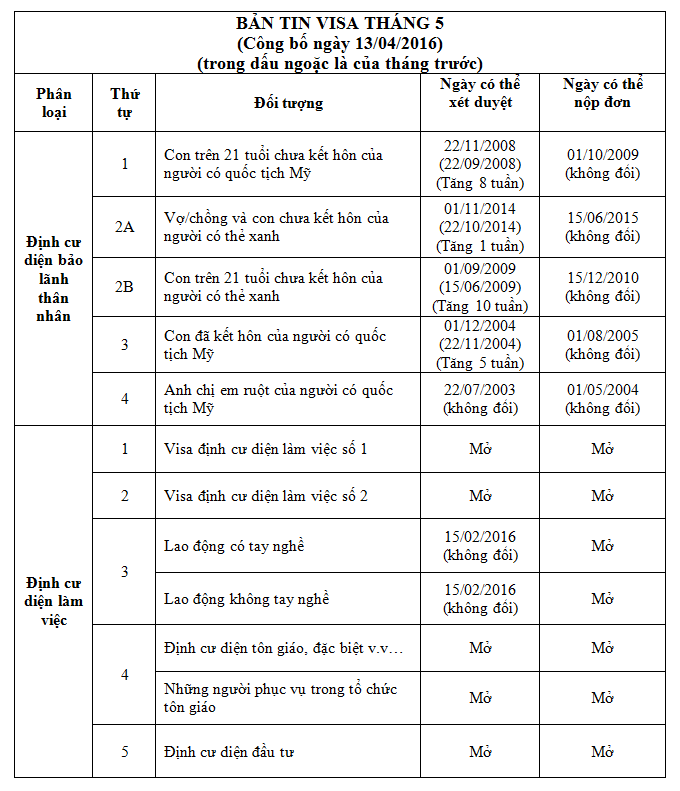 Trong bản tin Visa tháng 05 công bố ngày 12/05/2016 của Bộ ngoại giao Mỹ cho thấy, ngày có thể xét duyệt của diện làm việc số 3 không đổi, ngày có thể nộp đơn mở nên việc tiến hành các thủ tục cấp thẻ Xanh sẽ không có bất cứ hạn chế nào.