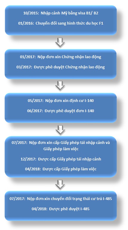 Luật sư của Misamo sẽ giúp khách hàng chuyển đổi tình trạng B1/B2 sang F-1 rồi sau đó chuyển đổi tình trạng cư trú cho khách hàng khi đang ở Hoa Kỳ. Khi nộp đơn I-485 khách hàng có thể nộp cùng lúc đơn xin cấp thẻ phối hợp (Combo Card) bao gồm: đơn xin giấy phép làm việc (I-765) và đơn xin giấy phép du hành (I-131). Sau khi nhận được thẻ phối hợp, khách hàng có thể làm việc tại Hoa Kỳ và có thể du lịch về Việt Nam. Các con của khách hàng có thể theo học tại các trường công lập trong thời gian chờ đợi kết quả của đơn I-485.
