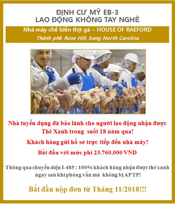 House Of Raeford là nhà tuyển dụng lớn, đã được kiểm chứng qua việc bảo lãnh rất nhiều thẻ xanh cho người lao động nước ngoài suốt 18 năm qua.  Và hiện tại họ vẫn đang và sẽ tiếp tục bảo lãnh cho người lao động nước ngoài. Nhà tuyển dụng cam kết tuân thủ đúng theo luật của Mỹ: tự trả chi phí khi nộp đơn vào Bộ lao động (DOL), cũng như sẽ gửi “Thư mời làm việc” đến các khách hàng của Misamo, những người sẽ tham dự phỏng vấn để lấy Visa định cư EB-3. Thư mời làm việc này được nộp cho nhân viên tại Lãnh sự quán khi đến phỏng vấn.